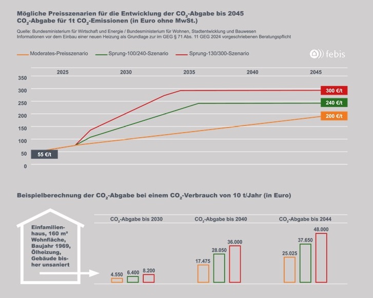 Das Bundesministerium für Wirtschaft und Energie und das Bundesministerium für Wohnen, Stadtentwicklung und Bauwesen haben in den „Informationen vor dem Einbau einer neuen Heizung als Grundlage zur im GEG § 71 Abs. 11 GEG 2024 vorgeschriebenen Beratungspflicht“ mögliche Preisentwicklungen abgebildet. Unter anderem diese drei Szenarien, die wir für ein typisches Einfamilienhaus, Baujahr 1969 mit 160 Quadratmetern Wohnfläche durchgerechnet haben. Das unsanierte Eigenheim verbraucht ca. 3.700 l Heizöl oder ca. 5.000 m³ Erdgas. Das entspricht ca. 10 Tonnen CO₂-Emissionen im Jahr. Summiert man die CO₂ -Abgabe auf, zeigt sich schnell welche Kosten neben den eigentlichen Heizkosten zusätzlich anfallen.